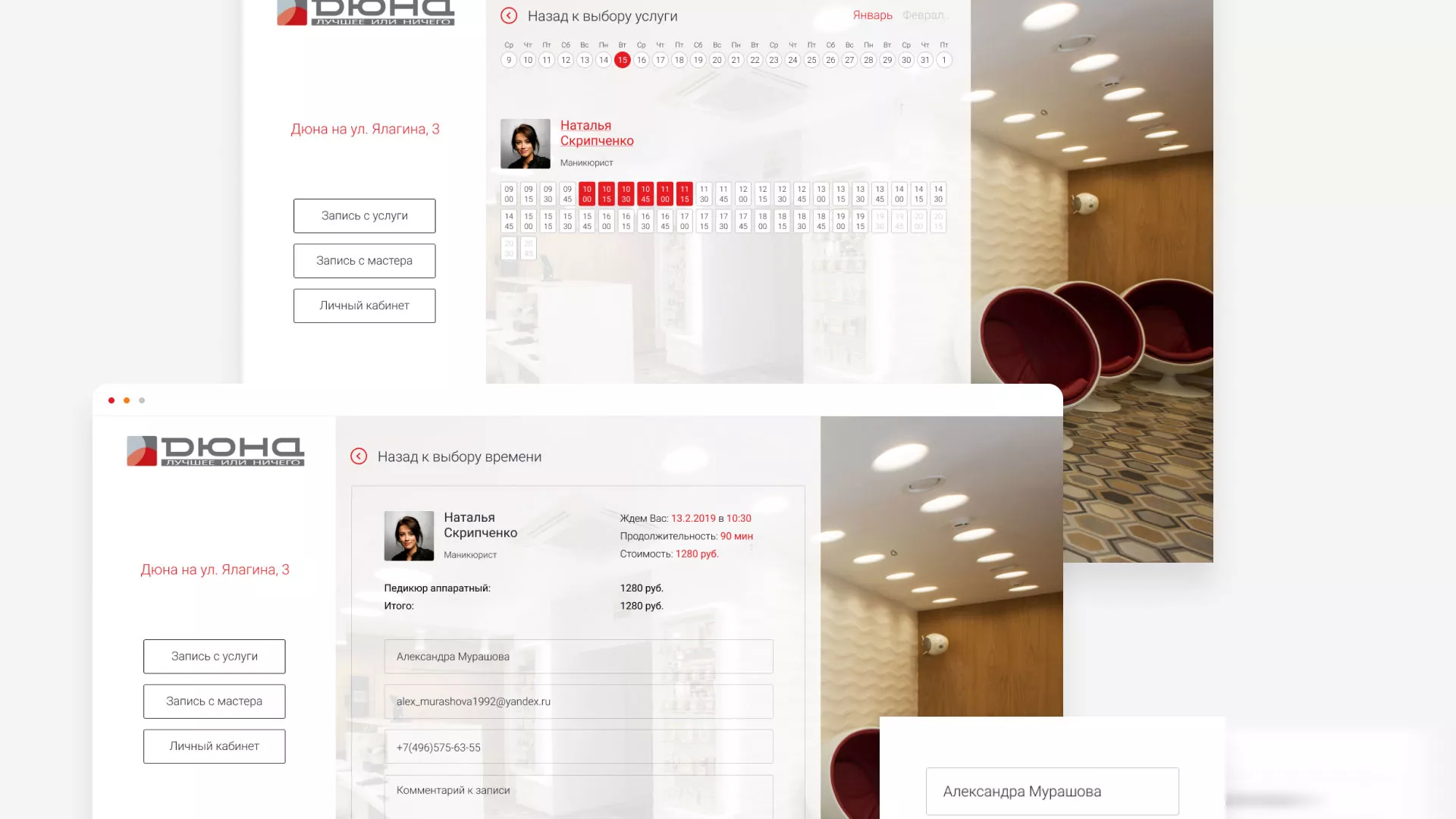 В разделе «Личный кабинет» содержатся все текущие записи в салоны красоты в Малмыже, с возможностью их отмены. Также, здесь можно редактировать свои персональные данные, ознакомиться с историей записей и видеть бонусы и акции салонов красоты.